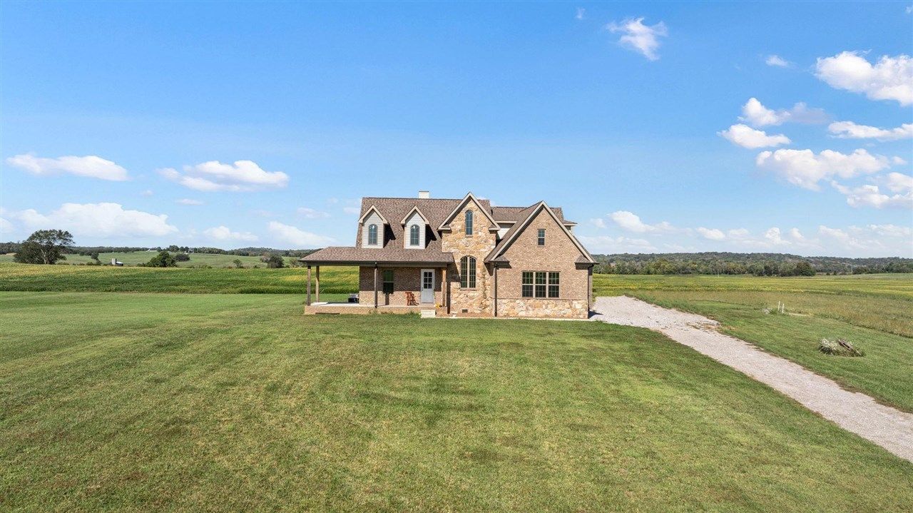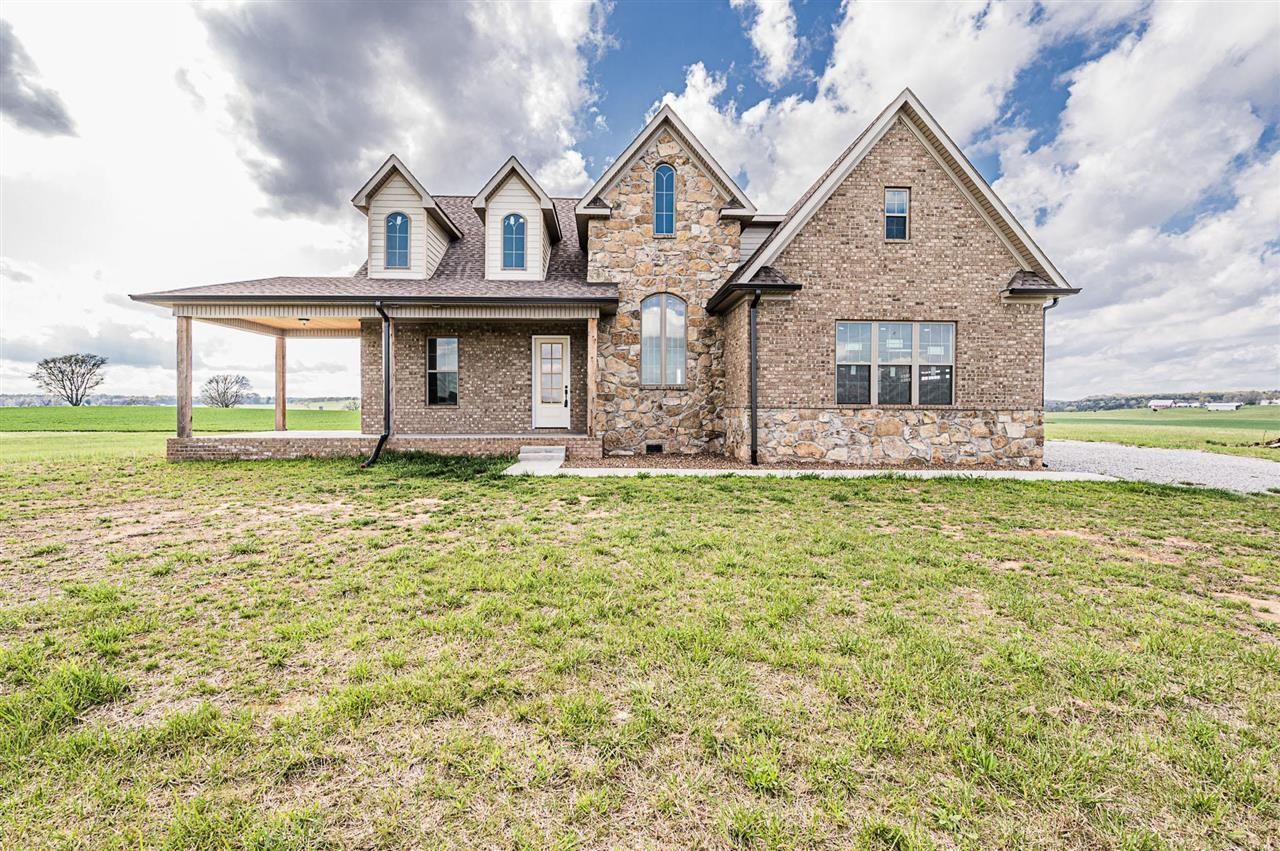 Nestled in the rolling countryside just outside the charming town of Auburn, Kentucky, this beautiful custom-built home offers the perfect balance of peaceful rural living and convenient access to nearby amenities. Auburn, a quaint community of just over 1,700 residents, sits about one hour north of Nashville and only 12 miles from Bowling Green, where youâ??ll find shopping, dining, and everyday conveniences. The property includes two adjoining legal parcels totaling 2.38 acres (1.19 acres each), offering flexibility for future possibilities such as a second home, workshop, barn, or additional outbuilding. The home is set well back off the road along a quiet country stretch with gently rolling land buffering neighboring properties. Built in 2023, the home features solid 2x6 construction and a striking brick and stone façade. Custom covered front and rear porches and patios create ideal spaces to relax and enjoy sweeping panoramic farm views, with wide open countryside stretching as far as the eye can see behind the home. Inside, the spacious floor plan offers tall ceilings, a wide layout, and abundant windows, filling the home with natural light and scenic views from nearly every room. The kitchen includes a breakfast nook and large pantry, flowing into both the family room and living room, each featuring custom floor-to-ceiling fireplaces. The main-level primary suite offers a private retreat with a large bedroom and impressive bath featuring a custom walk-in shower, dual vanities, and a spacious walk-in closet. Upstairs youâ??ll find three additional bedrooms, an office, and a loft/study space, providing plenty of flexibility. Additional highlights include fiber internet, instant hot water, custom finishes throughout, and surveys on file for both parcels. Originally built as the ownerâ??s forever home, changing plans now create a great opportunity for the next owner.
