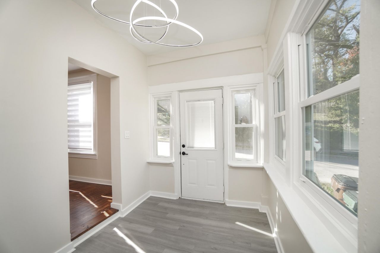 Amazing renovation! Versatile floor plan inverted two-story with walkouts on every level. Remodeled kitchen features quartz countertops, island, tile backsplash, stainless appliances & upgraded lighting package! Updated baths with ceramic tile & new fixtures. Beautiful refinished, original hardwood floors. Large entry and built-in coat caddy, storage/organizer. Formal dining room with exposed brick accent. Large primary bedroom/w nursery area and plenty of storage. Partial basement. Side concrete patio, rear wood deck overlooking fenced, private rear yard! Immediate occupancy.