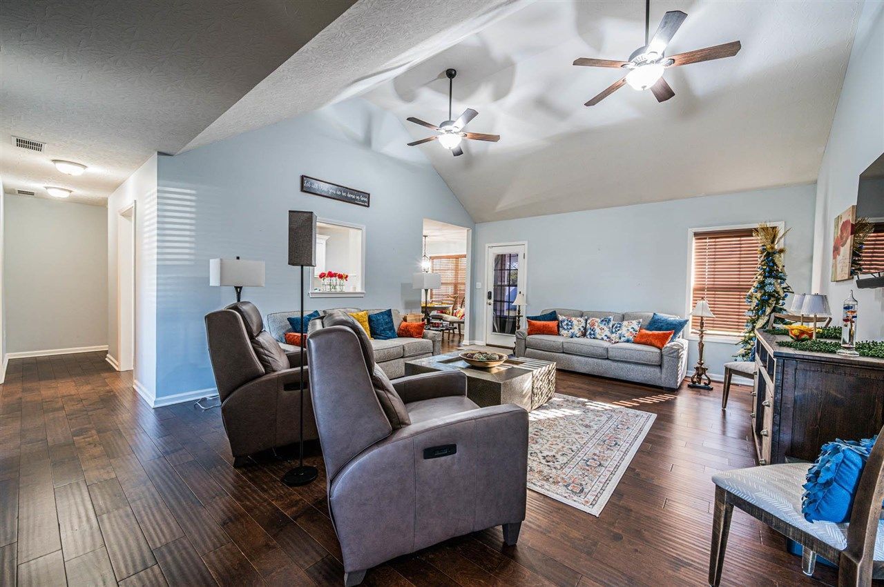Located in the desirable Springwater subdivision, this well-maintained vinyl home offers approximately 1,600 square feet with a functional and inviting layout. Featuring four bedrooms and two full baths, this home provides flexibility for a variety of living needs. Upon entry, you are welcomed by a foyer that opens into a spacious great room with engineered hardwood flooring throughout the main living areas. The great room flows seamlessly into the kitchen, complete with a pass-through and an eat-in dining area, making it ideal for everyday living and entertaining. The primary suite is privately positioned and offers generous space, a large tile shower, and ample closet storage. Two additional bedrooms and a full bath are located on one side of the home, while a fourth bedroom with a front-facing picture window provides versatility for guests, office space, or additional living needs. The standout feature of this property is the outdoor living space. Step outside to an oversized covered patio that offers plenty of room for dining and lounging. The fenced backyard, complemented by attractive stone landscaping, creates the perfect setting for relaxing or hosting gatherings. Conveniently located and move-in ready, this home offers comfort, space, and great outdoor appeal.